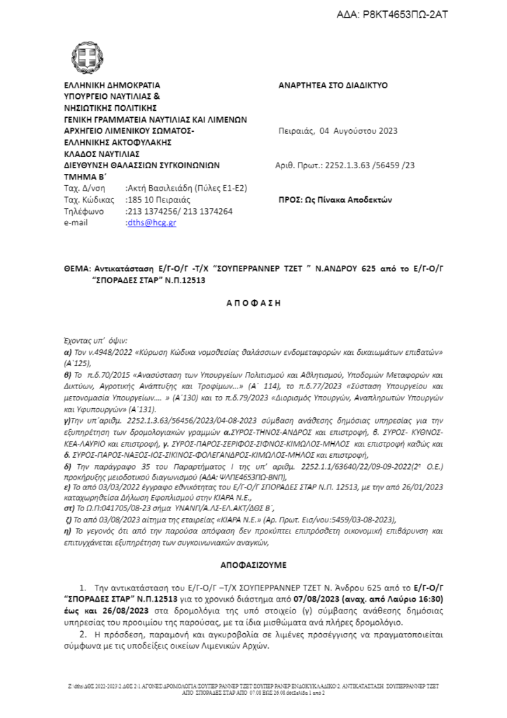 το Sporades Star θα πραγματοποιεί τα ενδοκυκλαδικά δρομολόγια σύμφωνα με την πρόσφατη ανακοίνωση του Υπουργείου Ναυτιλίας.