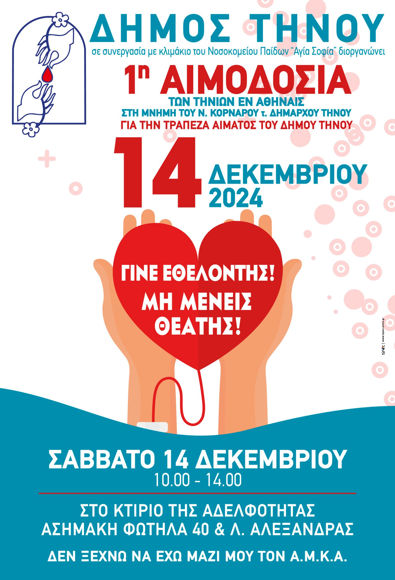 Ο Δήμος Τήνου τολμά, και πραγματοποιεί την 1η ΕΘΕΛΟΝΤΙΚΗ ΑΙΜΟΔΟΣΙΑ το Σάββατο 14 Δεκεμβρίου 2024 (ώρες: 10:00 – 14:00) στο κτίριο της Αδελφότητας των εν Αθήναις Τηνίων (Λεωφόρος Αλεξάνδρας και Ασημάκη Φωτήλα 42), με την βεβαιότητα ότι οι συντοπίτες μας που ζουν στην πρωτεύουσα θα στηρίξουν αυτή την προσπάθεια, με μόνο στόχο την αύξηση των ετησίων φιαλών αίματος, της δικής μας Τράπεζας Αίματος.