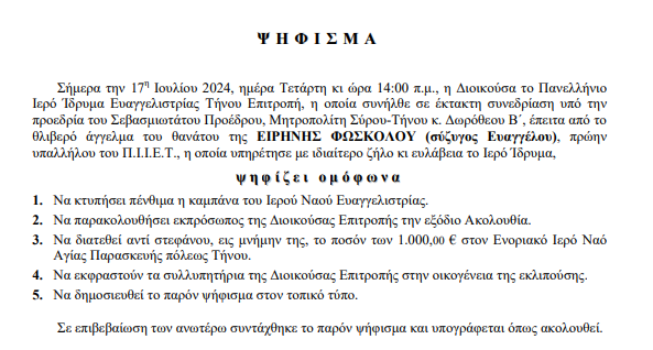Σήμερα την 17η Ιουλίου 2024, ημέρα Τετάρτη κι ώρα 14:00 π.μ., η Διοικούσα το Πανελλήνιο Ιερό Ίδρυμα Ευαγγελιστρίας Τήνου Επιτροπή, η οποία συνήλθε σε έκτακτη συνεδρίαση υπό την προεδρία του Σεβασμιωτάτου Προέδρου, Μητροπολίτη Σύρου-Τήνου κ. Δωρόθεου Β΄, έπειτα από το θλιβερό άγγελμα του θανάτου της ΕΙΡΗΝΗΣ ΦΩΣΚΟΛΟΥ (σύζυγος Ευαγγέλου), πρώην υπαλλήλου του Π.Ι.Ι.Ε.Τ., η οποία υπηρέτησε με ιδιαίτερο ζήλο κι ευλάβεια το Ιερό Ίδρυμα,