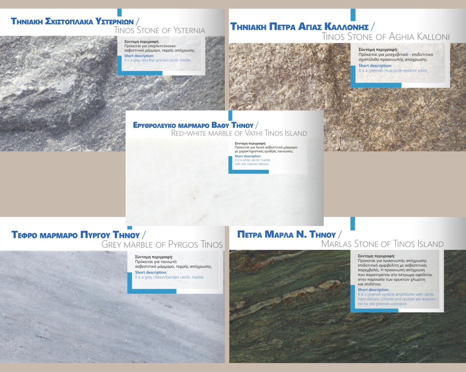 Για κάθε υλικό αποδόθηκε μία συγκεκριμένη «ταυτότητα» η οποία περιλαμβάνει γεωλογικά στοιχεία, φυσικομηχανικές ιδιότητες, χημική ανάλυση, πετρογραφία, καθώς και στοιχεία εξόρυξης, εφαρμογών και χρήσεων.