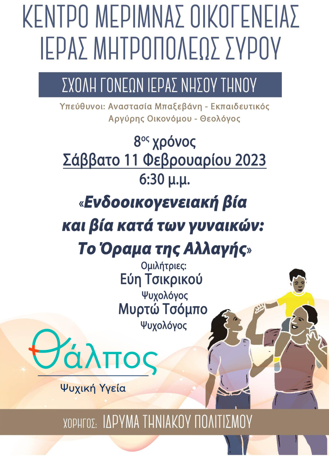 Το Σάββατο 11 Φεβρουαρίου του 2023 στις 18.30 θα πραγματοποιηθεί η συνάντηση για τη “Σχολή Γονέων Ιεράς Νήσου Τήνου” με ομιλήτριες την Εύη Τσικρικού (ψυχολόγος) και την Μυρτώ Τσόμπο (ψυχολόγος).