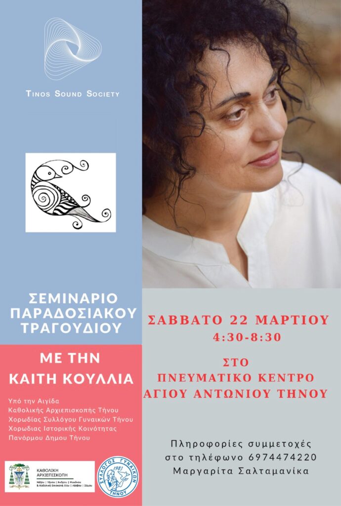Η Tinos Sound Society διοργανώνει ένα μοναδικό σεμινάριο παραδοσιακού τραγουδιού με την Καίτη Κουλλιά, το Σάββατο 22 Μαρτίου, από τις 16:30 έως τις 20:30, στο Πνευματικό Κέντρο Αγίου Αντωνίου Τήνου.