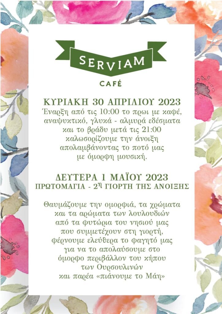 Θαυμάζουμε την ομορφιά, τα χρώματα και τα αρώματα των λουλουδιών από τα φυτώρια του νησιού μας που συμμετέχουν στην γιορτή, φέρνουμε ελεύθερα το φαγητό μας για να το απολαύσουμε στο όμορφο περιβάλλον περιβάλλον του κήπου των Ουρσουλινων και παρέα “πιάνουμε το Μάη”