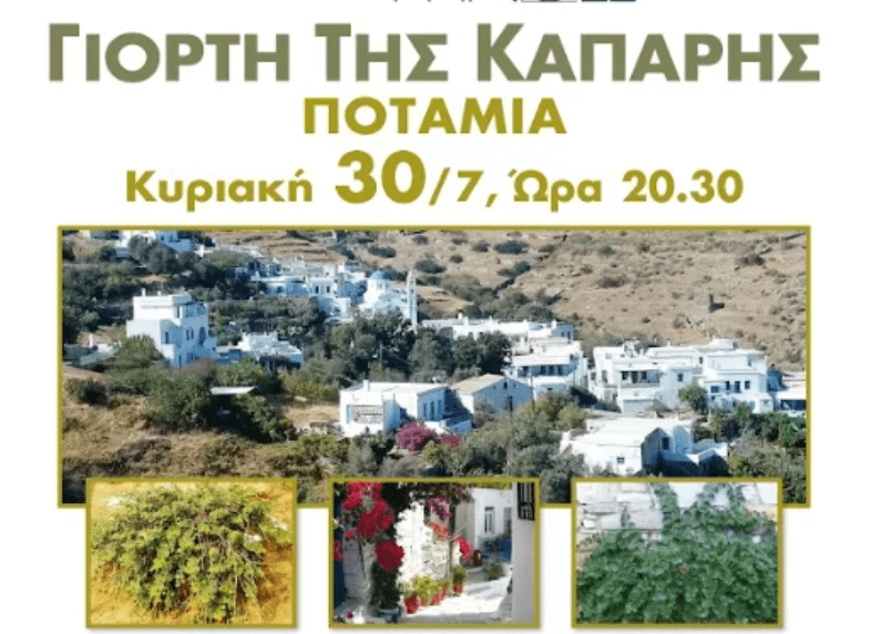 Σύλλογοι Ποταμιά Γιορτή της Κάπαρης στην Ποταμιά Ακούστε αυτό το άρθρο Η καθιερωμένη και πολύ επιτυχημένη ετήσια γιορτή της κάπαρης με προσεγμένο φαγητό και νησιώτικα ακούσματα με τους Οδυσσέα Τσουμπό, Παναγιώτη Μάνεση, Νίκο Στεφανή, Ιάκωβο Σκαλκώτο, Βικτώρα Παλαμάρη Είσοδος: 10€ Γιορτή της Κάπαρης στην Ποταμιά Προσεχείς εκδηλώσεις όλα τα events Κοινοποίηση FacebookWhatsAppViberΗΛΕΚΤΡΟΝΙΚΗ ΔΙΕΥΘΥΝΣΗCopy URL Πρόγραμμα επισκέψεων αγροτικών Ιατρών για το μήνα Φεβρουάριο 06.02.2024 Το πρόγραμμα επισκέψεων των αγροτικών ιατρών για τον μήνα... Πραγματοποιήθηκε η κοπή της πρωτοχρονιάτικης πίτας του Πολιτιστικού Συλλόγου Ποταμιάς Τήνου 22.01.2024 Το Σάββατο,21/1, μετά το πέρας της θείας Λειτουργίας στον... Κοπή πίτας από το Σύλλογο Ποταμιάς Τήνου 19.01.2024 "Καλησπέρα σε όλους και καλή χρονιά! Το ΔΣ του... Πίτες Συλλόγων και Κοινοτήτων στην Τήνο [19-20-21/1] 18.01.2024 Συνεχίζονται οι πίτες στα χωριά των συλλόγων και των...