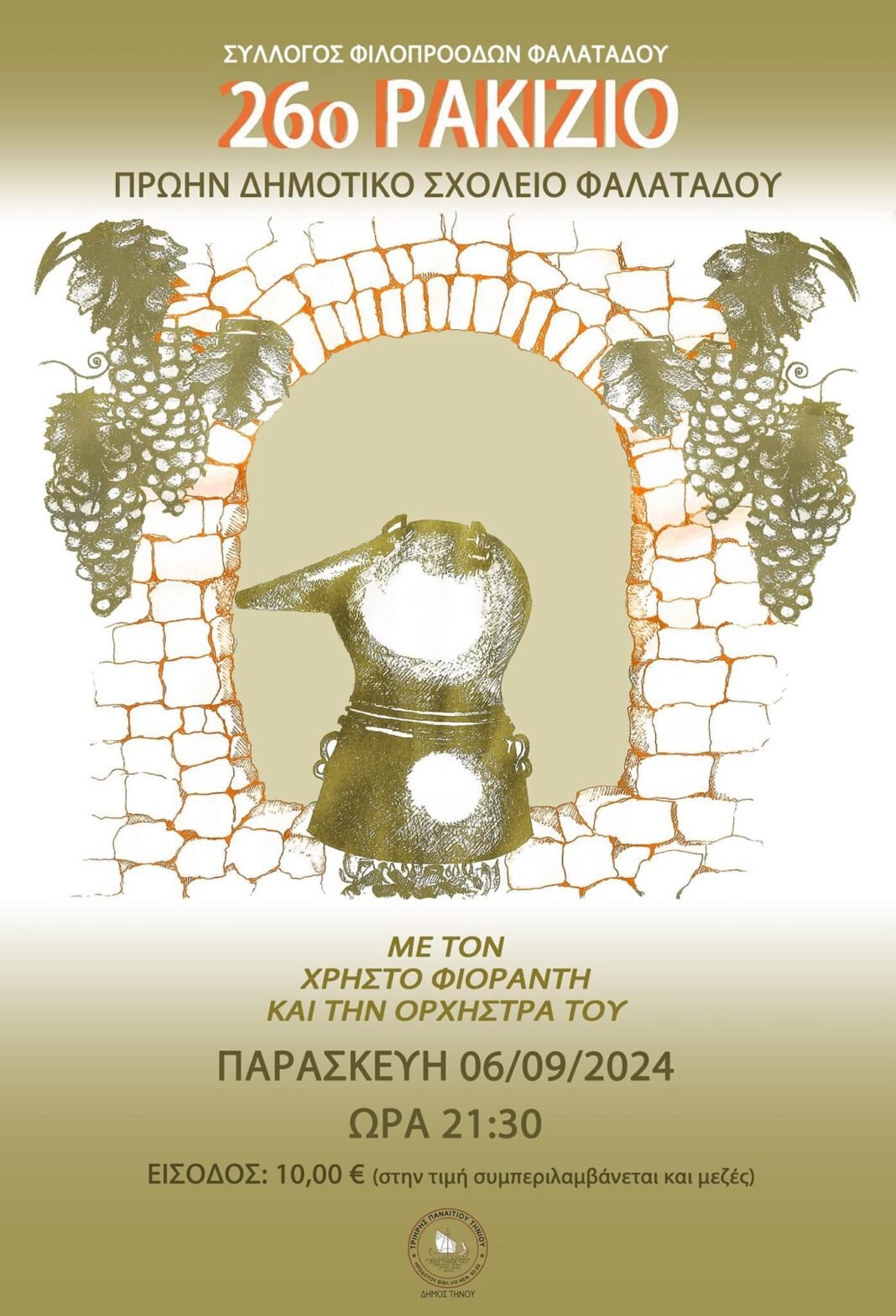 O Σύλλογος Φιλοπροόδων Φαλατάδου σας προσκαλεί με χαρά στο 26ο Ρακιζιό που θα πραγματοποιηθεί Παρασκευή 6 Σεπτεμβρίου 2024 στο πρώην δημοτικό σχολείο Φαλατάδου!