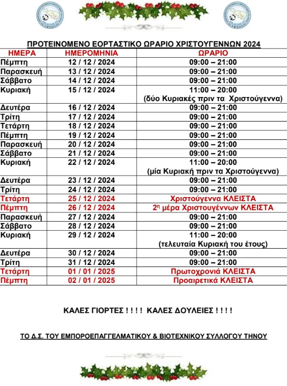Από σήμερα, Πέμπτη 12 Δεκεμβρίου, τίθεται σε ισχύ το Εορταστικό Ωράριο στην Τήνο, όπως ανακοίνωσε ο Εμποροεπαγγελματικός και Βιοτεχνικός Σύλλογος του νησιού. Το πρόγραμμα θα διαρκέσει μέχρι την Πέμπτη 2 Ιανουαρίου 2025, διευκολύνοντας το αγοραστικό κοινό κατά τη διάρκεια των εορτών.