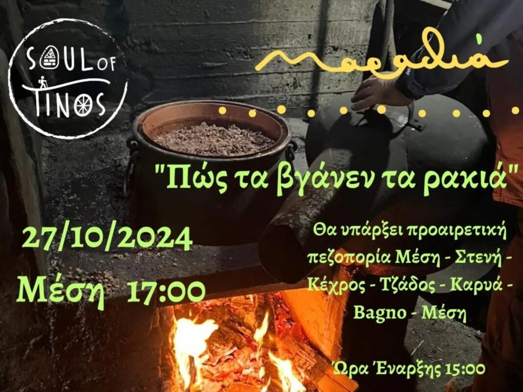 Την Κυριακή 27/10, στις 17:00 , σας περιμένουμε να βγάλουμε μαζί τα ρακιά στη Μέση. Μαθαίνουμε την από πάππου προς πάππου τεχνική της απόσταξης βήμα βήμα, τη συμβολική σημασία της φωτιάς στην Τηνιακή κουλτούρα, ξεκαζανιάζουμε και μοιραζόμαστε όλη τη γλύκα της στιγμής μαζί με Πανωμερίτικους ντόπιους μεζέδες του ρακιζιού και ψαρομεζέδες στην οδοντογλυφίδα από την αγαπημένη φίλη μας Μαραθιά.