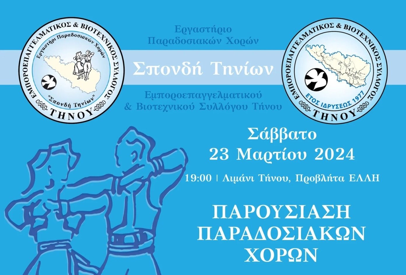 Το εργαστήρι παραδοσιακών χορών «ΣΠΟΝΔΗ ΤΗΝΙΩΝ» του Εμποροεπαγγελματικού & Βιοτεχνικού Συλλόγου Τήνου, σας προσκαλεί στην παρουσίαση παραδοσιακών χορών το Σάββατο 23 Μαρτίου 2024, στις 19:00, στο εσωτερικό λιμάνι της Τήνου στον προβλήτα «ΕΛΛΗ».