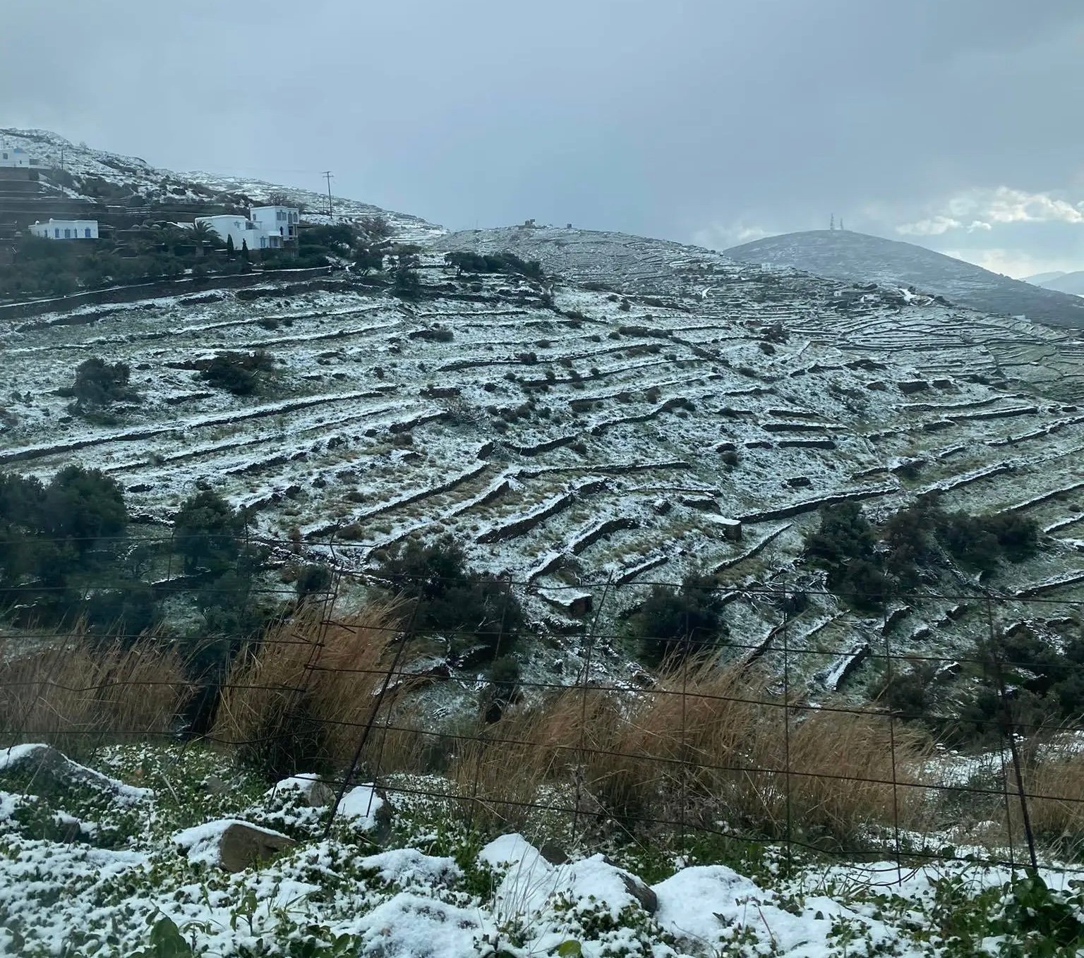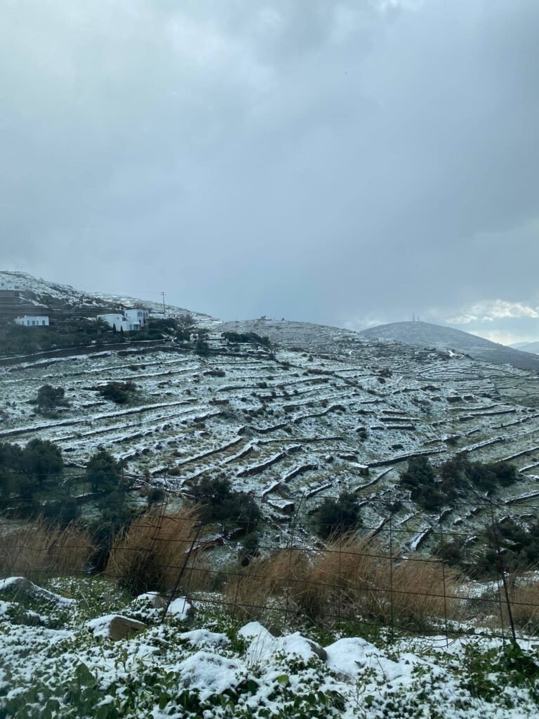Η κακοκαιρία Μπάρμπαρα έφερε χιόνια στην Τήνο και την έντυσε στα λευκά.