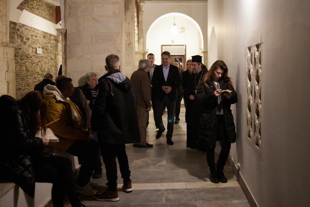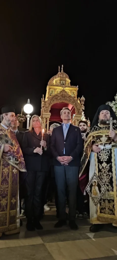 Το βράδυ ο κ. Μητσοτάκης παρακολούθησε την Ακολουθία του Επιταφίου Θρήνου, συνοδευόμενος από τη σύζυγό του, Μαρέβα Γκραμπόφσκι – Μητσοτάκη, στον Ιερό Ναό Ευαγγελιστρίας Τήνου. Από τις πιο συγκινητικές στιγμές στο νησί είναι όταν οι πέντε επιτάφιοι συναντώνται στην πλατεία της Παντάνασσας.