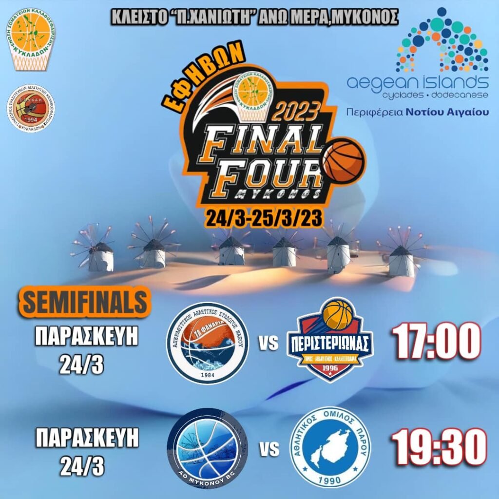 Το Final Four Εφηβων Daktylidis φιλοξενεί στις 24 και 25 Μαρτίου η Μύκονος. Με στις 24 Μαρτίου (17:00) ο πρώτος αγώνας για την ομάδα του Περιστεριώνα με τον ΑΠΑΣ ΝΑΞΟΥ και το Σάββατο 25 ο μικρός και μεγάλος τελικός.