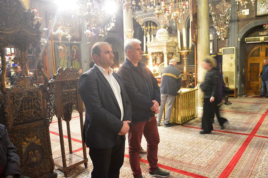 Κατά την παρουσία του στο νησί, παρέστη στην κατανυκτική Θεία Λειτουργία στην Παναγιά Ευαγγελίστρια και επισκέφτηκε χωριά της Τήνου  όπου συναντήθηκε με μέλη του ΠΑΣΟΚ και αρκετούς πολίτες. Στον Πύργο μάλιστα, βρέθηκε και στο εκπληκτικό μουσείο μαρμαροτεχνίας.  Στη συνέχεια είχε επαφές και συνομιλία με εργαζόμενους σε υπηρεσίες του Δήμου και του Επαρχείου Τήνου.