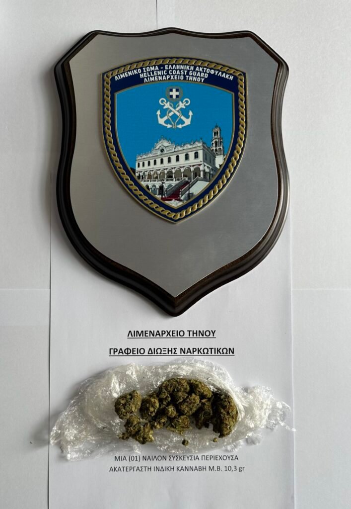 Στη σύλληψη ενός (01) ημεδαπού, ηλικίας 27 ετών, προέβησαν μεσημβρινές ώρες την 11/08/2023, Στελέχη γραφείου Δίωξης Ναρκωτικών του Λιμεναρχείου Τήνου, διότι μετά από διενέργεια ελέγχου εντοπίστηκε και κατασχέθηκε μία (01) νάιλον συσκευασία περιέχουσα ακατέργαστη ινδική κάνναβη, συνολικού μικτού βάρους δέκα γραμμαρίων και τριών δεκάτων του γραμμαρίου (10,3 γρ.).
