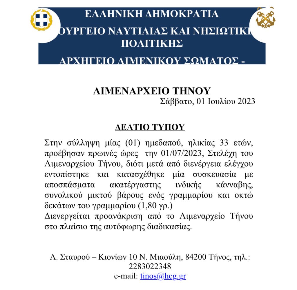 Σύλληψη 33 χρονης ημεδαπού για ναρκωτικά στην Τήνο