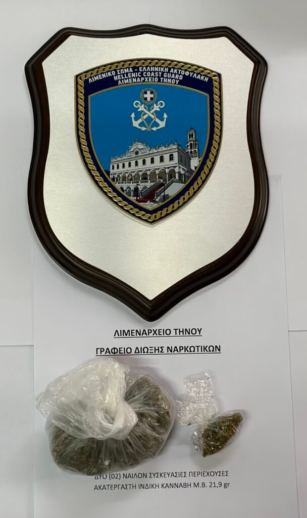 Στη σύλληψη ενός (01) ημεδαπού, ηλικίας 25 ετών, προέβησαν βραδινές ώρες την 25/07/2023, Στελέχη γραφείου Δίωξης Ναρκωτικών του Λιμεναρχείου Τήνου, διότι μετά από διενέργεια ελέγχου εντοπίστηκαν και κατασχέθηκαν δύο (02) νάιλον συσκευασίες περιέχουσες ακατέργαστη ινδική κάνναβη, συνολικού μικτού βάρους είκοσι ενός γραμμαρίων και εννέα δεκάτων του γραμμαρίου (21,9 γρ.). Διενεργείται προανάκριση από το Λιμεναρχείο Τήνου στο πλαίσιο της αυτόφωρης διαδικασίας.