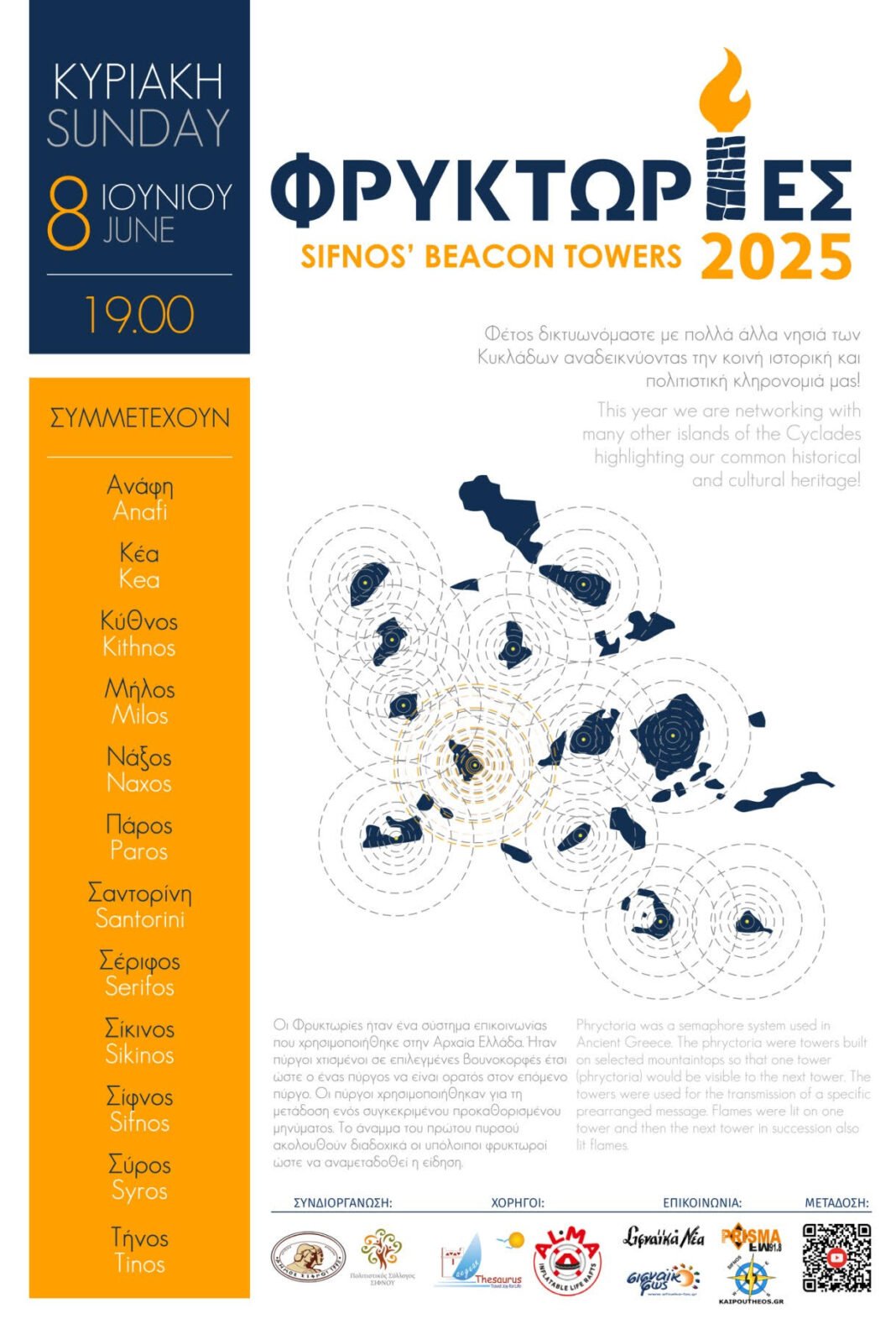 Ένα τέτοιο σύστημα επικοινωνίας υπήρχε και στις Κυκλάδες. Με πρωτοβουλία του πολιτιστικού συλλόγου Σίφνου και του Δήμου Σίφνου, το έθιμο της Φρυκτωρίας θα αναβιώσει και πάλι αύριο με τη συμμετοχή σχεδόν όλων των νησιών των Κυκλάδων.