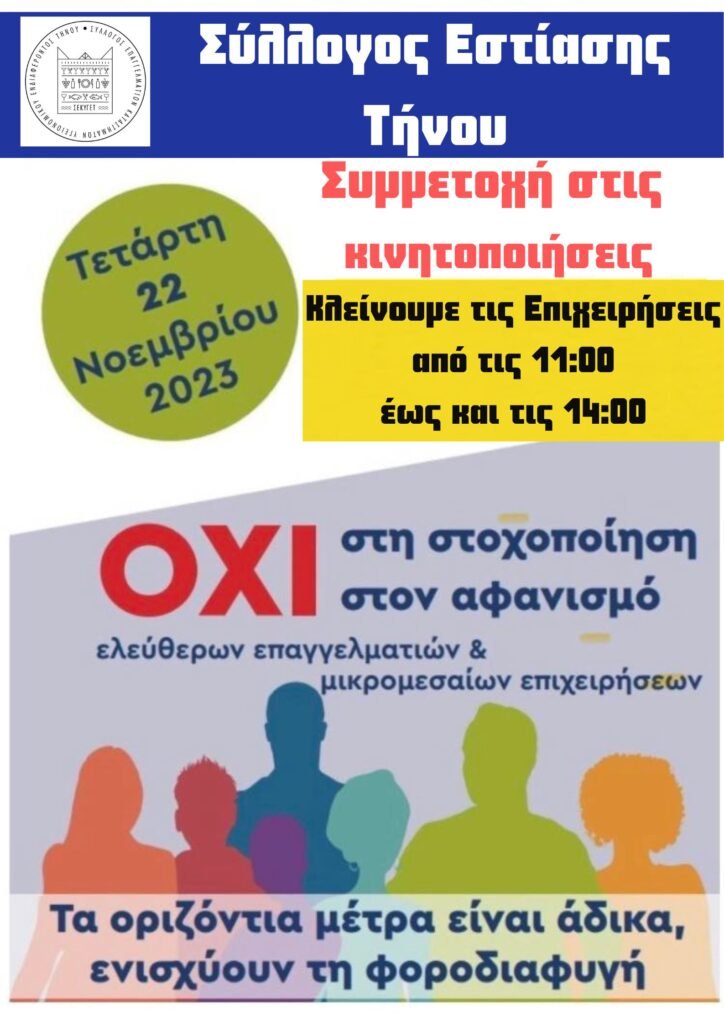 Κάλεσμα για συμμετοχή στις κινητοποιήσεις την Τετάρτη 22 Νοεμβρίου απευθύνει ο Σύλλογος Εστίασης Τήνου, με σκοπό να αποσυρθεί το νέο φορολογικό νομοσχέδιο του υπουργείου Οικονομικών, το οποίο χαρακτηρίζει «φοροφυγάδες» τους ελεύθερους επαγγελματίες.