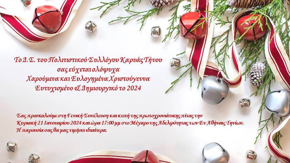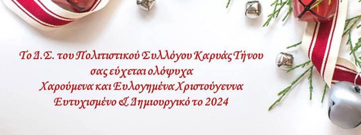 Το Διοικητικό Συμβούλιο του Πολιτιστικού Συλλόγου Καρυάς Τήνου σας εύχεται ολόψυχα Χαρούμενα και Ευλογημένα Χριστούγεννα, Ευτυχισμένο & Δημιουργικό το 2024.