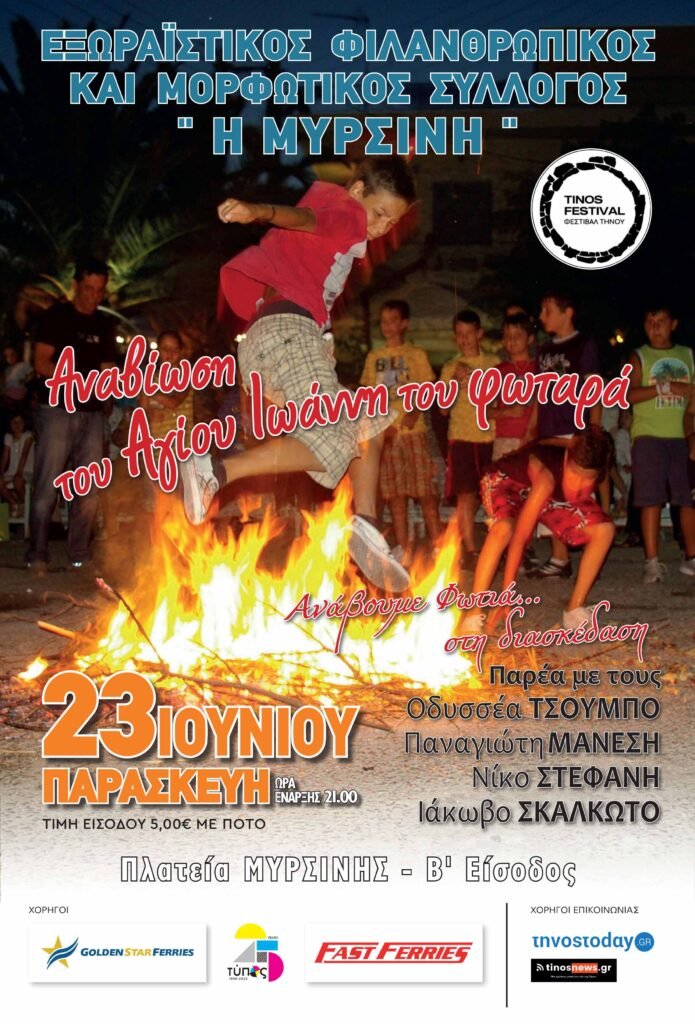 Ο Σύλλογος Μυρσίνης σας προσκαλεί στην αναβίωση εθίμου του Αγίου Ιωάννη του Φωταρά,στην πλατεία του χωριού μας την Παρασκευή 23 Ιουνιου στις 21.00.