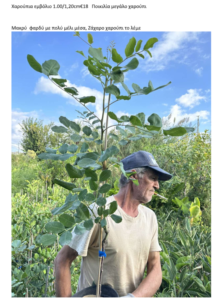 Ποικιλία: Ζαχαροχαρουπιά Κρήτης, σε γλάστρα 7κιλών ηλικίας τριών ετών, με ύψος 1,00μ-1,20μμ από το έδαφος, Το μπόλι σε ύψος  0,60μ από το έδαφος, καρπός ( μεγάλος, πλατύς, μακρύς, με πολύ μέλι)