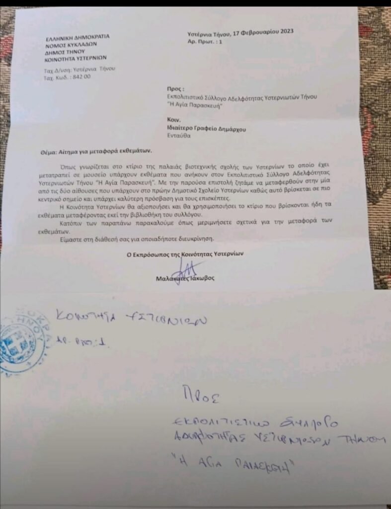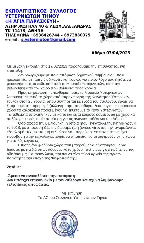 Στις 17/2/2023 λάβαμε την παρακάτω επιστολή η οποία μας προτρέπει να μεταφέρουμε τα εκθέματα του Μουσείου σε άλλο χώρο με προτεινόμενο το Πρώην Δημοτικό Σχολείο και να αδειάσουμε την βιβλιοθήκη.