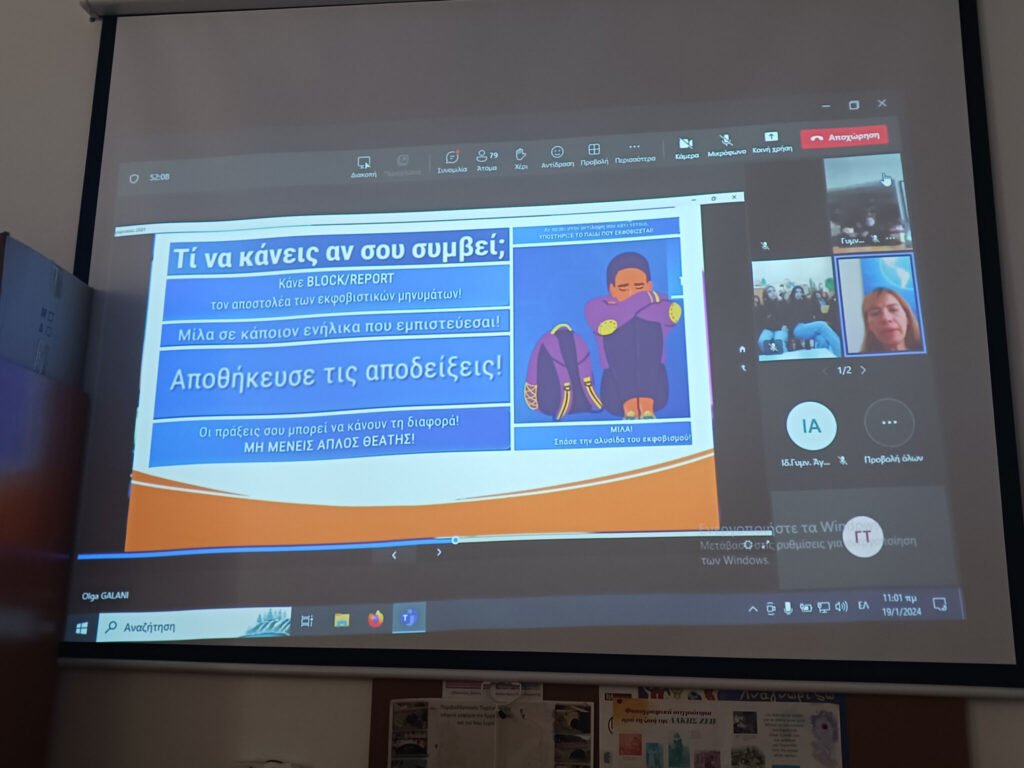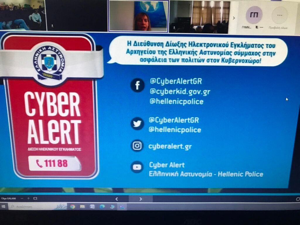 Την Παρασκευή 19 Ιανουαρίου τα τέσσερα τμήματα της Β’ τάξης του Γυμνασίου Τήνου παρακολούθησαν διαδικτυακή εκπαιδευτική εκδήλωση της Δίωξης Ηλεκτρονικού Εγκλήματος σχετικά με την ασφάλεια στο διαδίκτυο. Οι μαθητές ενημερώθηκαν για τα αδικήματα που τελούνται μέσω διαδικτύου, τους κινδύνους που κρύβονται στις συνήθεις καθημερινές δραστηριότητες όλων μας (συναλλαγές, μέσα κοινωνικής δικτύωσης, διαδικτυακά παιχνίδια), το φαινόμενο του διαδικτυακού εκφοβισμού καθώς και τα μέσα προστασίας από πιθανούς κινδύνους ή αδικήματα.