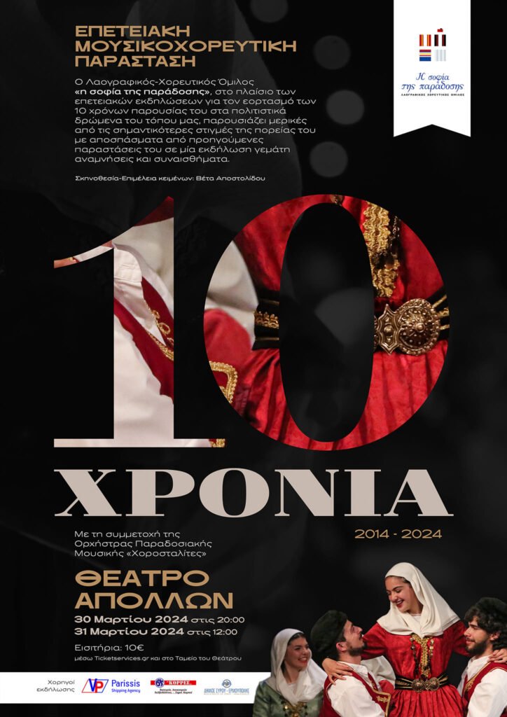 Το χορευτικό του Συλλόγου Γυναικών Τήνου θα συμμετάσχει στα πλαίσια των επετειακών εκδηλώσεων για τον εορτασμό των 10 χρόνων παρουσίας του Λαογραφικού-Χορευτικού Ομίλου «η σοφία της παράδοσης»,