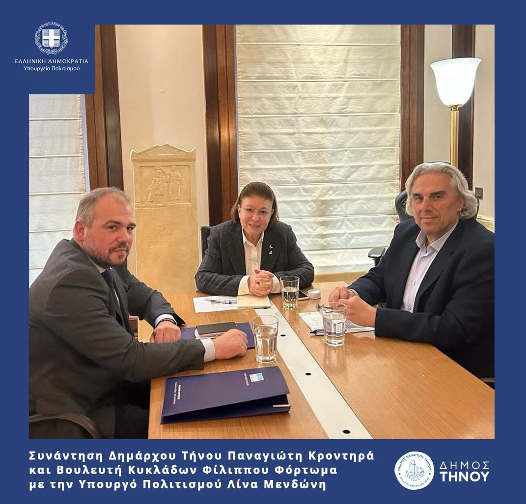 ✅ Κατά τη διάρκεια της συνάντησης, έγινε ταυτόχρονα εκτενής αναφορά σε ζητήματα που αφορούν το νησί της Τήνου και ιδιαιτέρως για την Ιερά Μονή Ουρσουλινών καθώς και τον Ιερό Ναό του Αγίου Ιωσήφ στα Λουτρά. Και για τις δύο αυτές περιπτώσεις, η Υπουργός εξέφρασε στον Δήμαρχο Τήνου και τον Βουλευτή Κυκλάδων της Ν.Δ. την υποστήριξη του Υπουργείο Πολιτισμού.