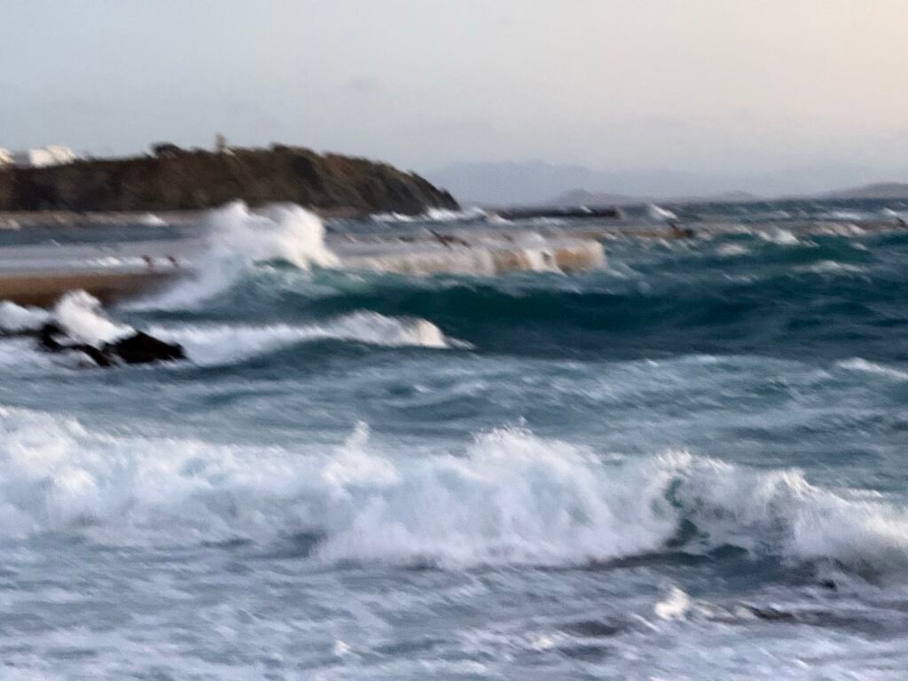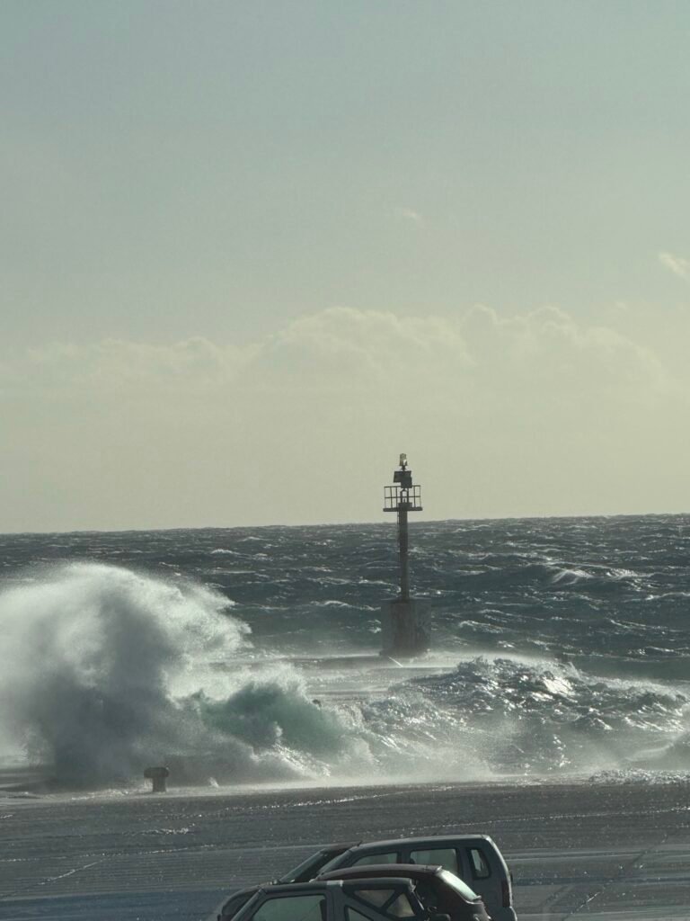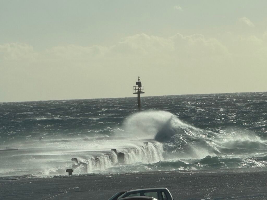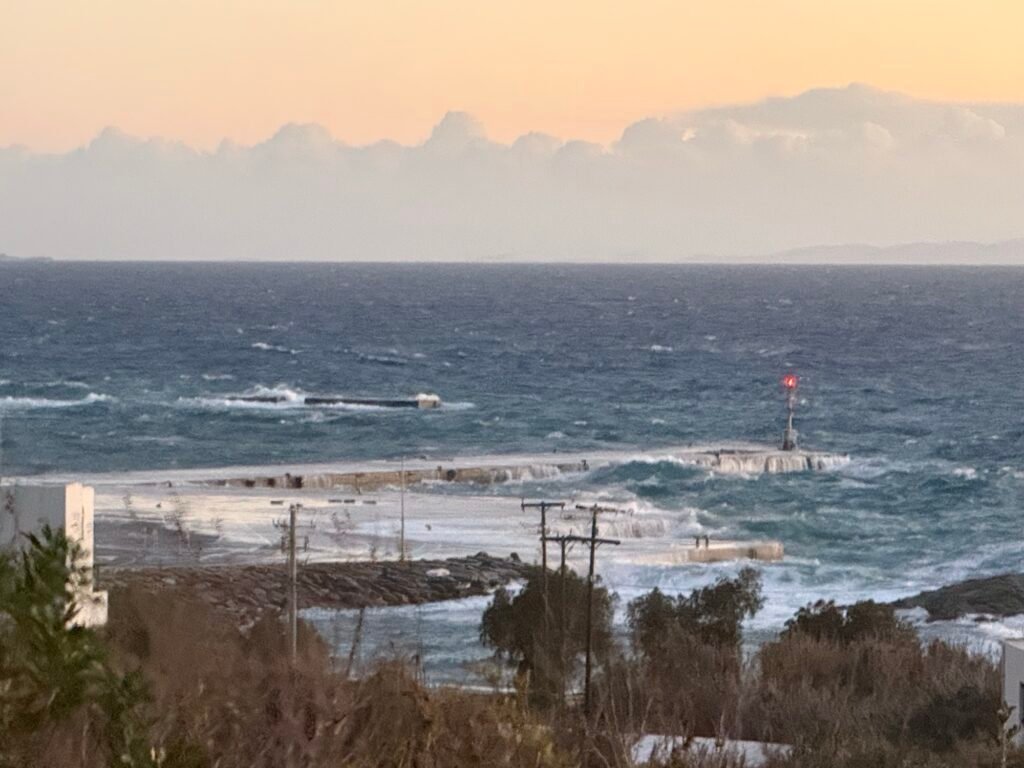Στο λιμάνι, το έντονο κύμα βγαίνει στον μόλο, δημιουργώντας εικόνες που θυμίζουν ποτάμι.