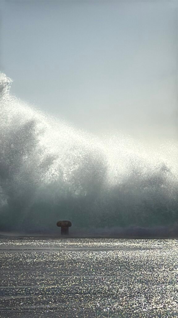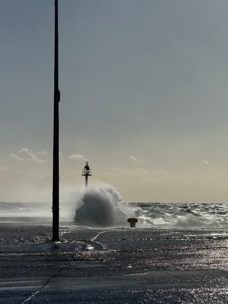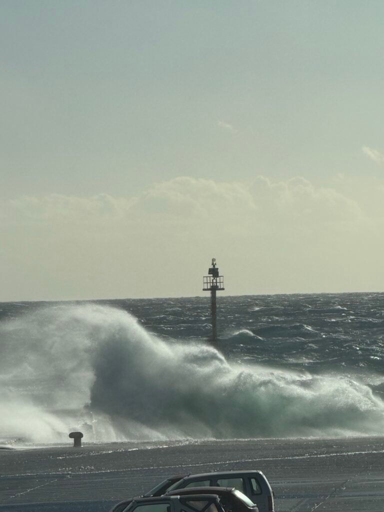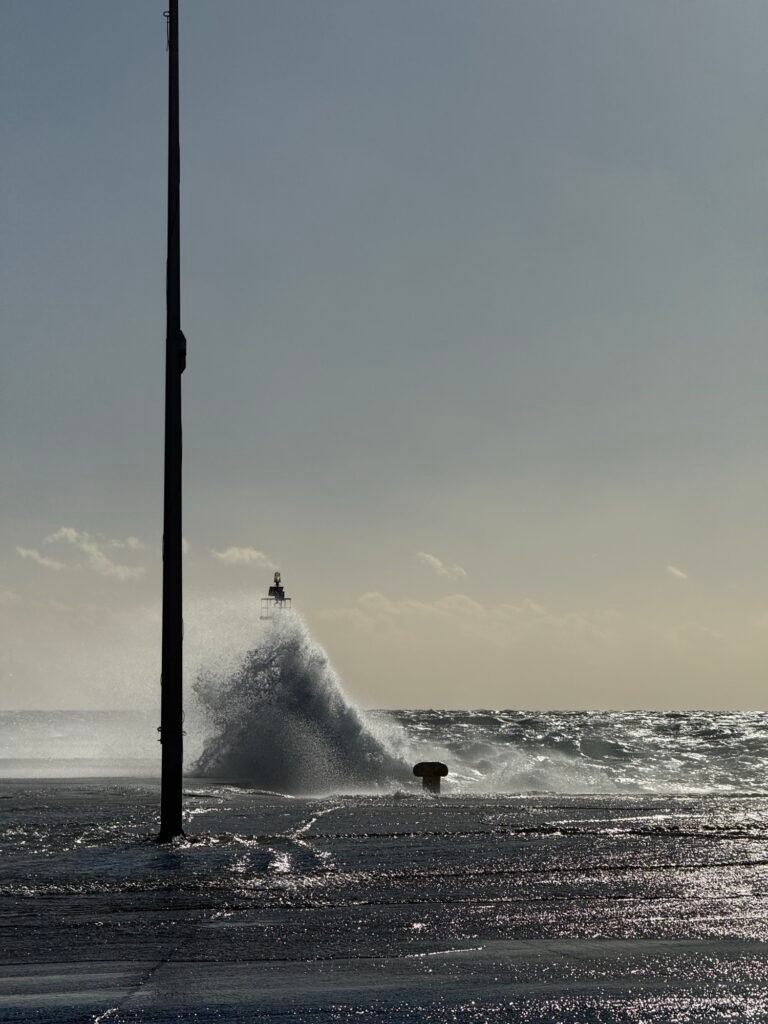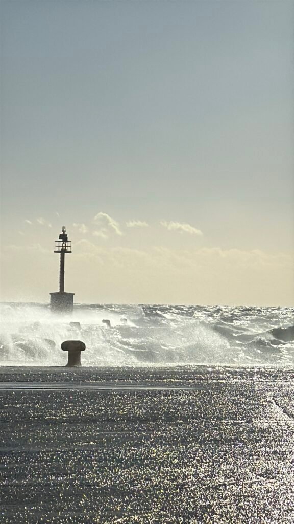 Στο λιμάνι, το έντονο κύμα βγαίνει στον μόλο, δημιουργώντας εικόνες που θυμίζουν ποτάμι.