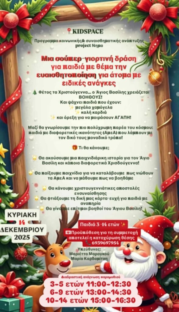 Τα Χριστούγεννα έρχονται για να μας χαρίσουν στιγμές ζεστασιάς και μαγείας! Το Kidspace υπόσχεται να χαρίσει χαμόγελα στους μικρούς μαθητές του νησιού και χριστουγεννιάτικες στιγμές δημιουργίας με λίγη… χρυσόσκονη! Οι μαθητες θα μεταμορφωθούν σε ξωτικά του Αγίου Βασίλη και θα τον βοηθήσουν στο εργαστήρι να ετοιμάσει τα δώρα του! Πρώτο Workshop: