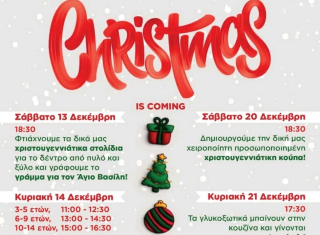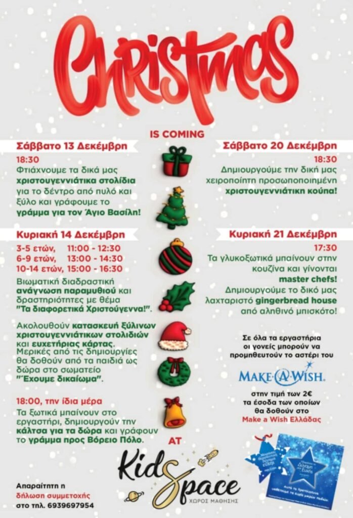 Τα Χριστούγεννα έρχονται για να μας χαρίσουν στιγμές ζεστασιάς και μαγείας! Το Kidspace υπόσχεται να χαρίσει χαμόγελα στους μικρούς μαθητές του νησιού και χριστουγεννιάτικες στιγμές δημιουργίας με λίγη… χρυσόσκονη! Οι μαθητες θα μεταμορφωθούν σε ξωτικά του Αγίου Βασίλη και θα τον βοηθήσουν στο εργαστήρι να ετοιμάσει τα δώρα του! Πρώτο Workshop: