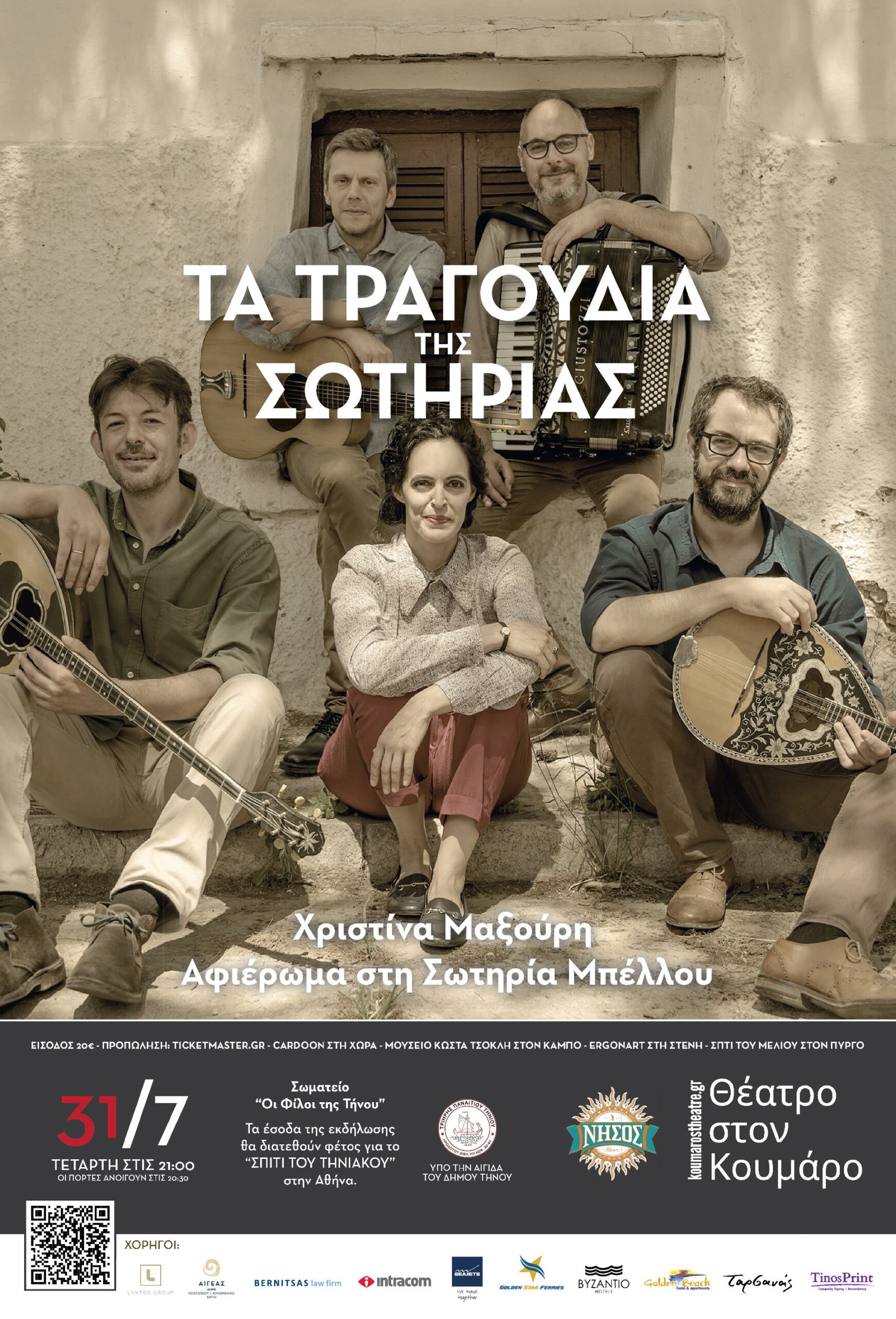 Θα θέλαμε να σας ανακοινώσουμε ότι για την μουσική εκδήλωση του σωματείου ΟΙ ΦΙΛΟΙ ΤΗΣ ΤΗΝΟΥ,  “Τα τραγούδια της Σωτηρίας” την Τετάρτη 31 Ιουλίου στο Θέατρο στον Κουμάρο, θα υπάρχει ειδικό δρομολόγιο των ΚΤΕΛ, το οποίο θα αναχωρήσει από την αφετήρια των ΚΤΕΛ στην Χώρα στις 20.00 και θα επιστρέψει στη Χώρα μετά τη λήξη της συναυλίας.