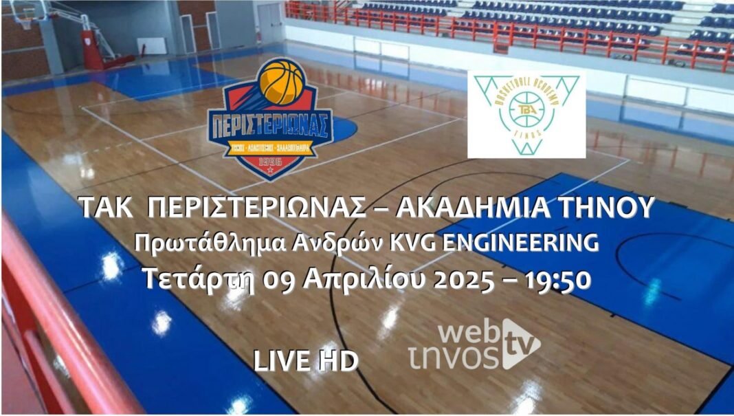 Παρακολουθήστε την Τετάρτη 9 Απριλίου 2025 στις 19:50 τον αγώνα μεταξύ των ομάδων ΤΑΚ Περιστεριώνας – Ακαδημία Τήνου για το Πρωτάθλημα Ανδρών KVG ENGINEERING της ΕΣΚΚ