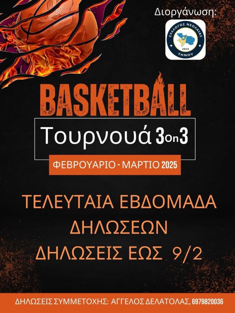 Ο Σύλλογος Νεολαίας Τήνου διοργανώνει τουρνουά μπάσκετ 3on3 για τους μήνες Φεβρουάριο και Μάρτιο 2025. Οι δηλώσεις συμμετοχής ολοκληρώνονται στις 9 Φεβρουαρίου, οπότε όσοι ενδιαφέρονται πρέπει να δηλώσουν άμεσα!