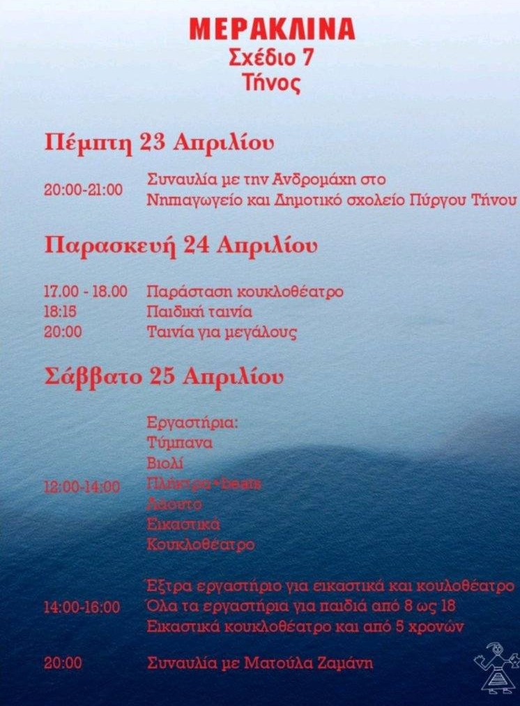 Ο Σύλλογος Γονέων και Κηδεμόνων Δημοτικού Σχολείου και Νηπιαγωγείου Πύργου Τήνου με χαρά φιλοξενεί την τελευταία στάση της «Μερακλίνας – Σχέδιο 7» στην Τήνο!