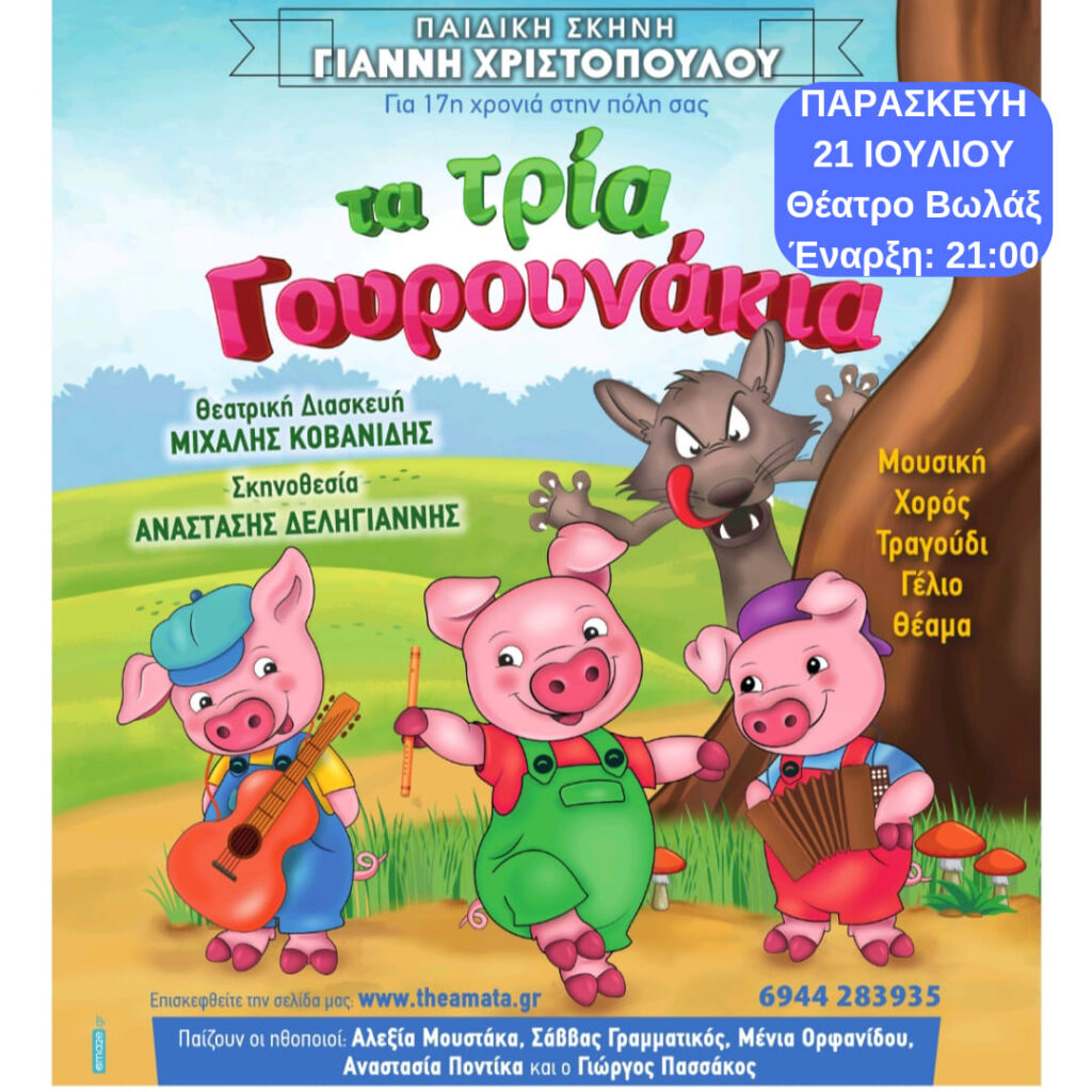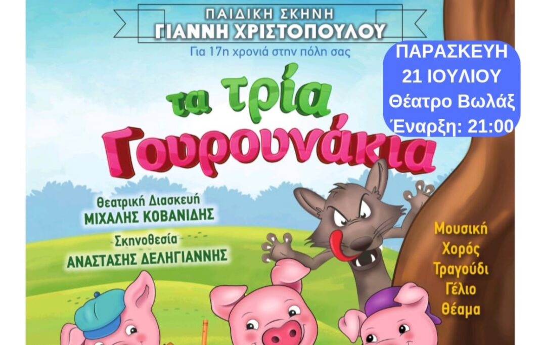 Αυτή την Παρασκευή, 21 Ιουλίου στο ανοικτό θέατρο Βωλάξ η παιδική παράσταση “τα τρία γουρουνάκια”