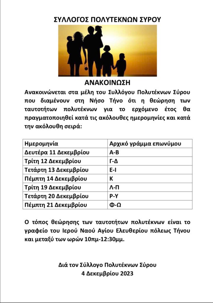 Ο τόπος θεώρησης των ταυτοτήτων πολυτέκνων είναι το γραφείο του Ιερού Ναού Αγίου Ελευθερίου πόλεως Τήνου και μεταξύ των ωρών 10πμ-12:30μμ.