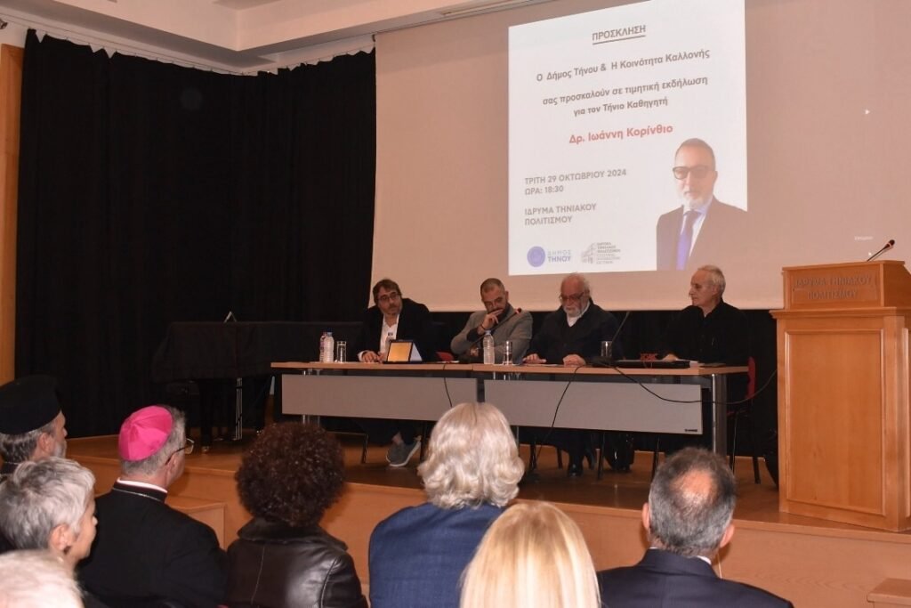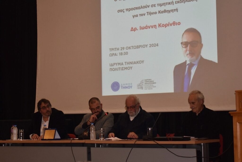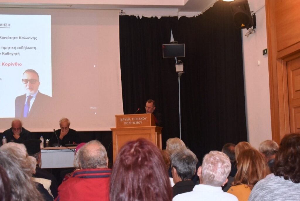 Ο Δήμος Τήνου σε συνεργασία με τη Δημοτική Κοινότητα Καλλονής και τον Περιβαλλοντικό & Πολιτιστικό Σύλλογο Καλλονής – Καρκάδου, πραγματοποίησαν την Τρίτη 29 Οκτωβρίου 2024 στο φιλόξενο Ι.ΤΗ.Π. εκδήλωση τιμής στο προαναφερόμενο τέκνο της Τήνου, κ. Ι. Κορίνθιο, ο οποίος διαπρέπει εκτός συνόρων, προβάλλοντας τη γενέτειρά του.