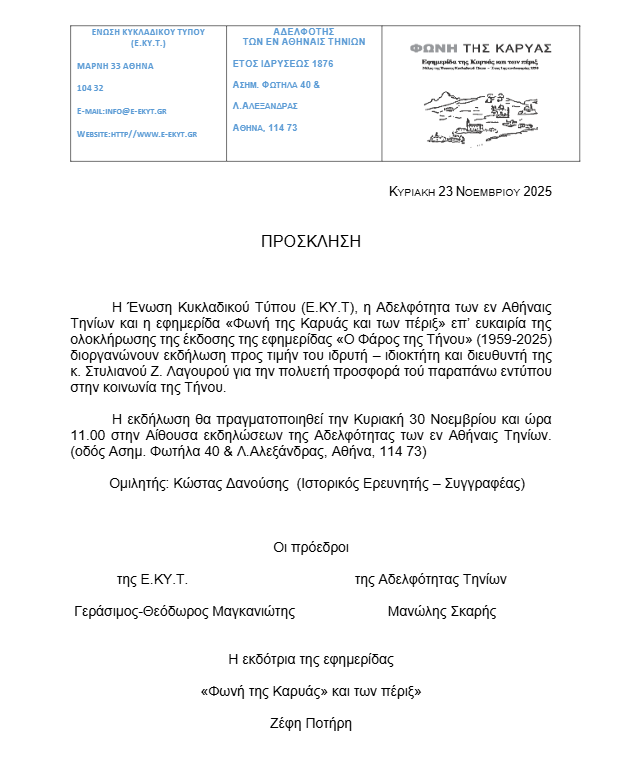 Η Ένωση Κυκλαδικού Τύπου (Ε.ΚΥ.Τ), η Αδελφότητα των εν Αθήναις Τηνίων και η εφημερίδα «Φωνή της Καρυάς και των πέριξ» επ’ ευκαιρία της ολοκλήρωσης της έκδοσης της εφημερίδας «Ο Φάρος της Τήνου» (1959-2025) διοργανώνουν εκδήλωση προς τιμήν του ιδρυτή – ιδιοκτήτη και διευθυντή της κ. Στυλιανού Ζ. Λαγουρού για την πολυετή προσφορά του παραπάνω εντύπου στην κοινωνία της Τήνου.