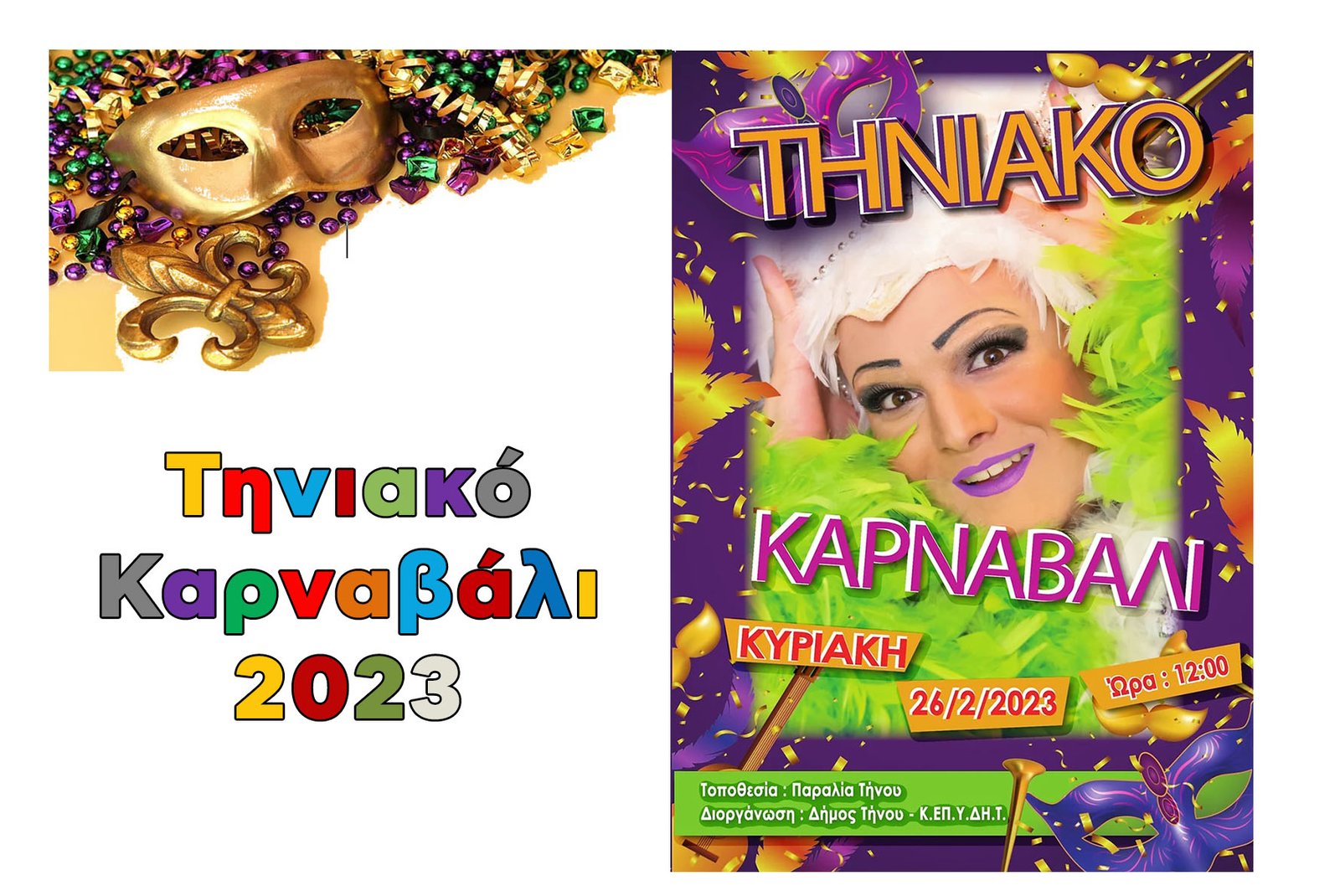 Την Κυριακή 26 Φεβρουαρίου 2023 θα πραγματοποιηθεί το Τηνιακό Καρναβάλι 2023, μετά από 2 χρόνια αποχής λόγω του Covid-19 το Τηνιακό Καρναβάλι επιστρέφει! Ραντεβού λοιπόν την Κυριακή στις 12:00!
