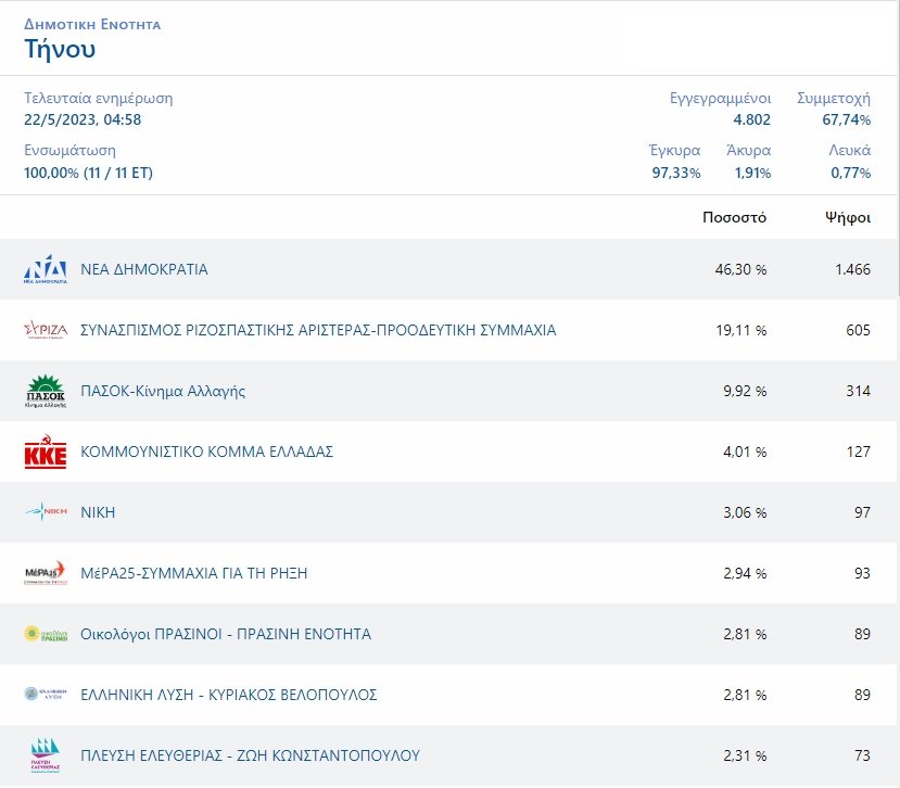 Ο ΣΥΡΙΖΑ ΠΣ και στην Τήνο έκανε μία εντυπωσιακή πτώση κοντα στους 900 ψήφους και τα ποσοστά του έπεσαν από το 33,12 του 2019 στο 18,48 για το 2023.