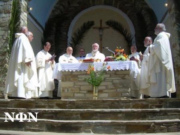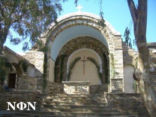 Στις 10,30πμ. αφού έφτασε εν πομπή, η εικόνα, ο κλήρος και λαός στο προσκύνημα του Βρυσιού, άρχισε η Αρχιερατική Θεία Λειτουργία με την συμμετοχή του κλήρου της Τήνου.