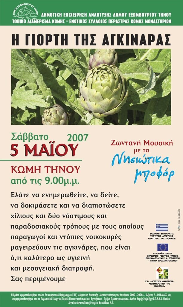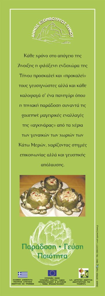Υπάρχει τρομερό υλικό τόσο από το Κανάλι του Μπάμπη Κουλουρά στο Youtube όσο και υλικό από τον Γιάννη Βιδάλη από την ιστοσελίδα του www.tinos.biz καθώς και ένα ένθετο στο 19ο Φύλλο της Διμηνιαίας ενημερωτικής έκδοσης του Δήμου Eξωμβούργου Tήνου “Εν Δράσει” σχετικά με το Φεστιβάλ της Αγκινάρας.