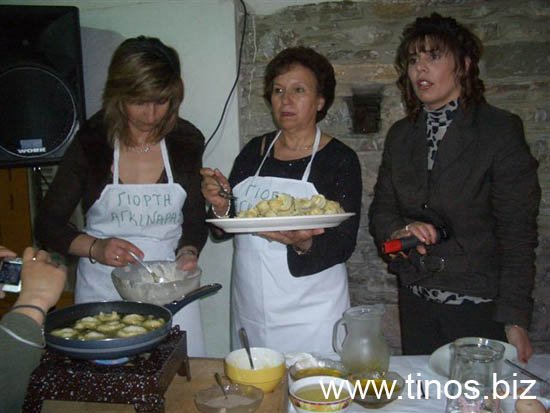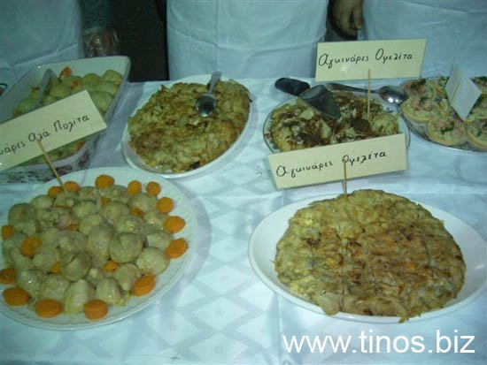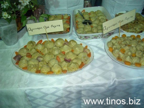 Για την παρασκευή τους χρειάστηκαν να καθαριστούν 7.500 περίπου αγκινάρες που προσφέρθηκαν από τους παραγωγούς του χωριού. Οι μαγειρικές συνοδεύτηκαν από μουσική και χορό αλλά και από μια ζωντανή παρουσίαση του τρόπο εκτέλεσης δύο συνταγών. Στα πλαίσια της προώθησης και της διαφήμισης της «τηνιακής αγκινάρας» τυπώθηκαν και διανεμήθηκαν στους επισκέπτες έξι διαφορετικά καρτ – ποσταλ με συνταγές που έχουν βάση την αγκινάρα. Ο Δήμαρχος τίμησε όλους όσους εργάστηκαν για την εκδήλωση αλλά και τον κ.Φόνσο που σύμφωνα με μαρτυρία του έφερε την αγκινάρα στην Κώμη. Αξίζουν θερμά συγχαρητήρια και ένα μεγάλο ευχαριστώ στις γυναίκες που βοήθησαν στην παρασκευή των φαγητών και στην πραγματοποίηση της όλης εκδήλωσης, στην πρόεδρο και τα μέλη του Τοπικού Συμβουλίου Κώμης για την άψογη οργάνωση και τέλος στους παραγωγούς του χωριού που προσέφεραν αφιλοκερδώς κάθε είδους προϊόντα που χρειάστηκαν για την παρασκευή των λιχουδιών.
