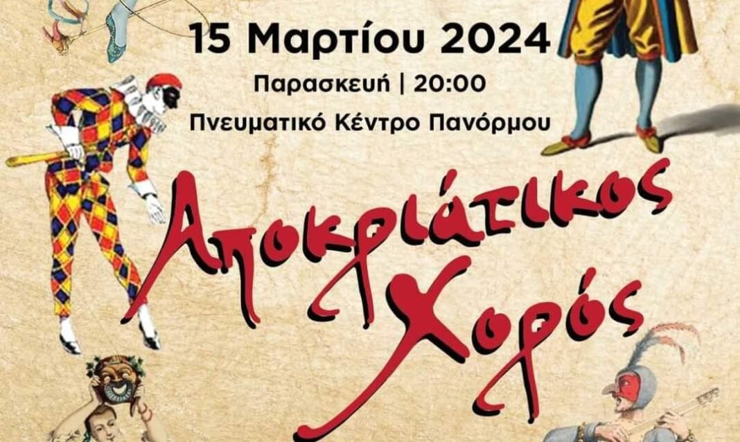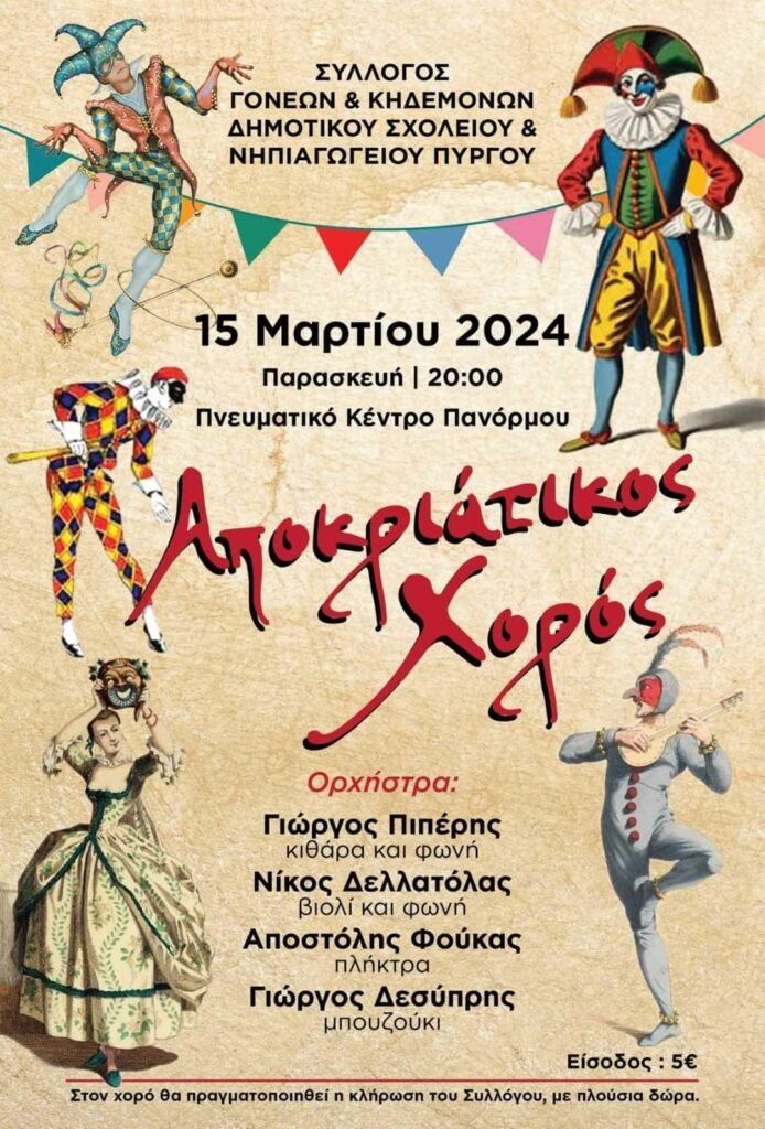 Ο Σύλλογος Γονέων & Κηδεμόνων Δημοτικού Σχολείου & Νηπιαγωγείου Πύργου σας καλεί στο Πνευματικό Κέντρο Πανόρμου στις 15 Μαρτίου 2024 για τον Αποκριάτικο Χορό.