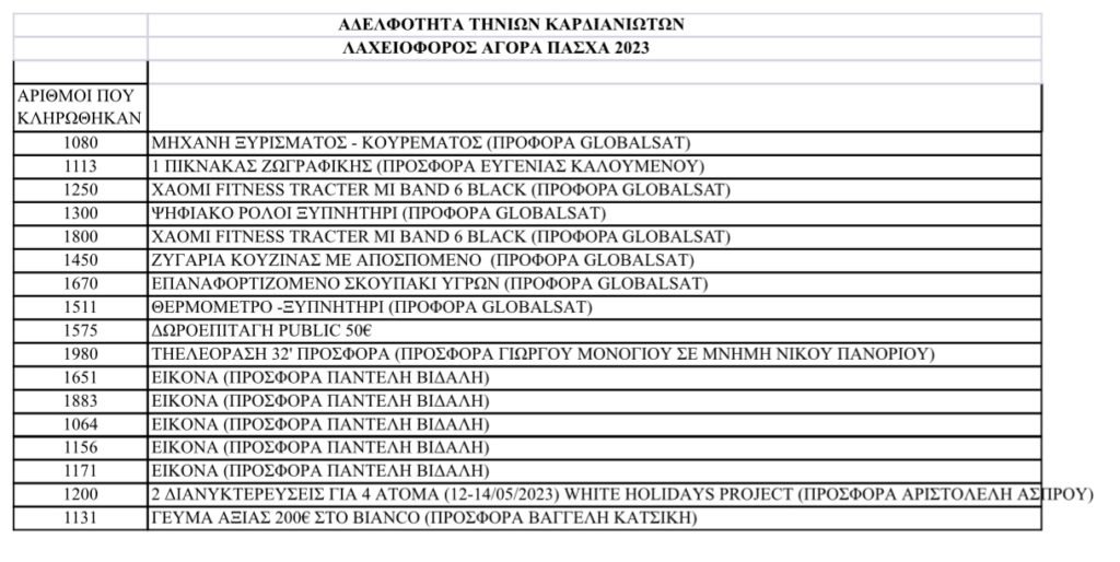 Αποτελέσματα Λαχειοφόρου Αγοράς για το Πανηγύρι Καρδιανής Τήνου.