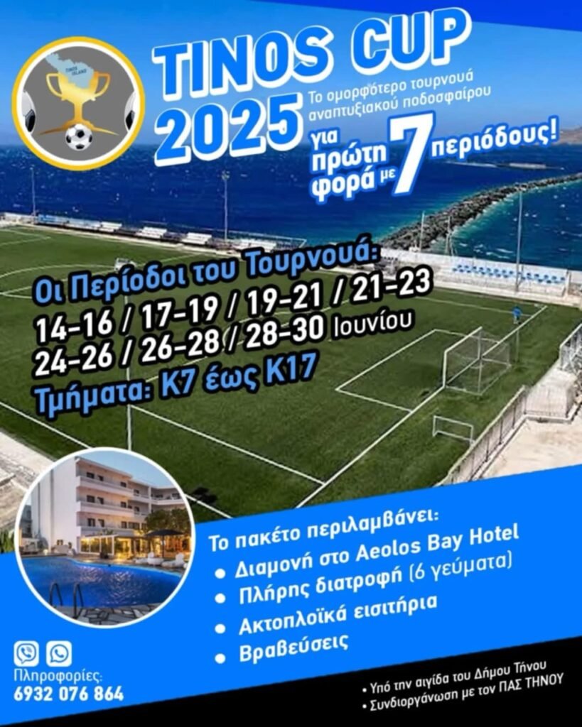 Το Tinos Cup 2025 έρχεται δυναμικά, προσφέροντας για πρώτη φορά 7 διαφορετικές περιόδους διεξαγωγής μέσα στον Ιούνιο. Το τουρνουά, που έχει καθιερωθεί ως ένα από τα πιο όμορφα και οργανωμένα αναπτυξιακά τουρνουά ποδοσφαίρου, απευθύνεται σε ομάδες από την κατηγορία Κ7 έως Κ17.