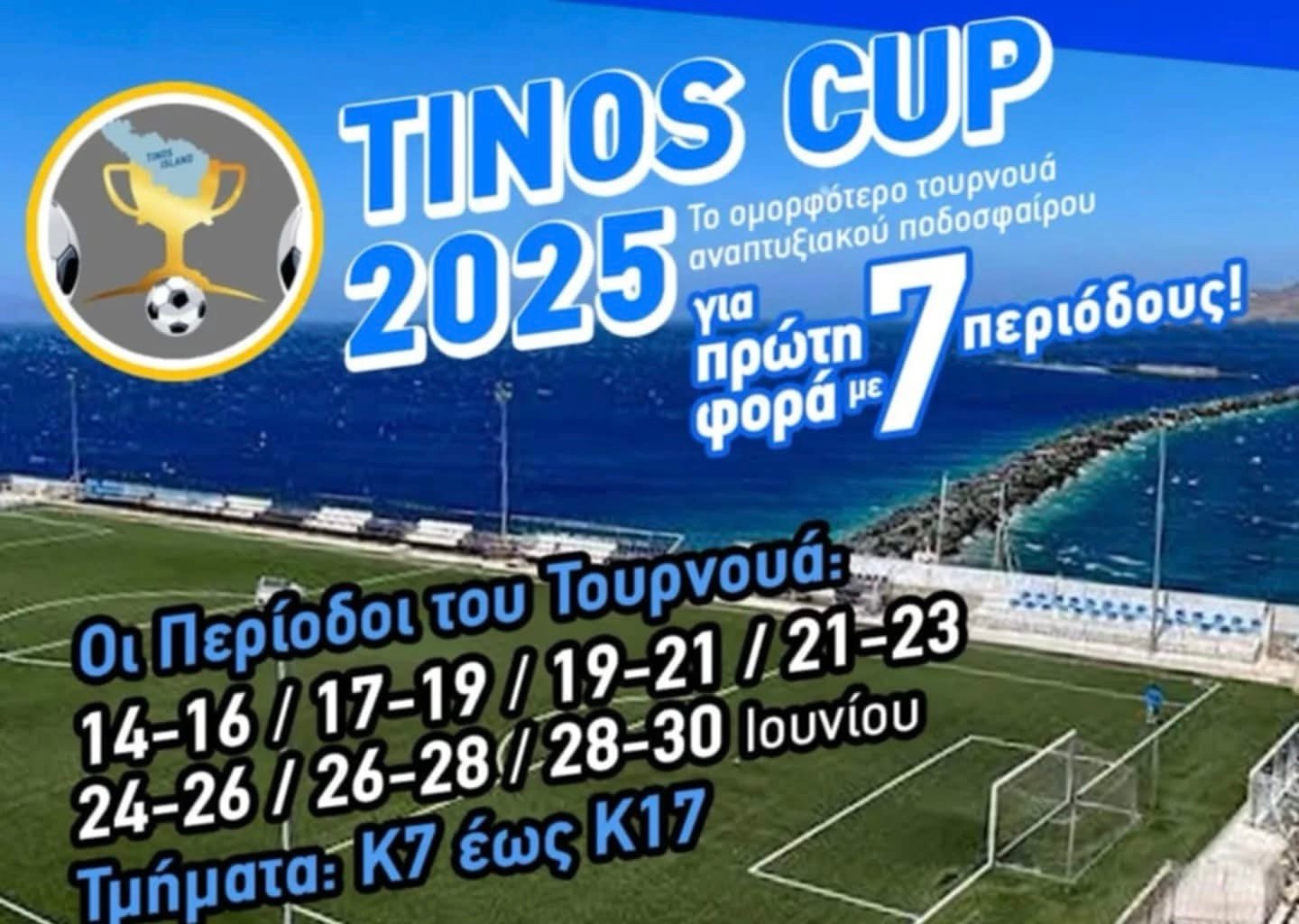 Το Tinos Cup 2025 έρχεται δυναμικά, προσφέροντας για πρώτη φορά 7 διαφορετικές περιόδους διεξαγωγής μέσα στον Ιούνιο. Το τουρνουά, που έχει καθιερωθεί ως ένα από τα πιο όμορφα και οργανωμένα αναπτυξιακά τουρνουά ποδοσφαίρου, απευθύνεται σε ομάδες από την κατηγορία Κ7 έως Κ17.