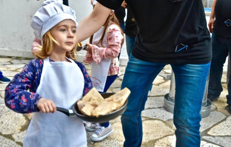 Κι ας έρθουμε στο σήμερα όπου οι μικροί μαγείροι καθ’ όλη τη διάρκεια των απαγγελιών μετέφεραν τα χωνάκια με το περιεχόμενο – μαραθοκεφτέδες, πατάτες και μπακαλιάρος, όλα στο τηγάνι- στους καθήμενους προσκαλεσμένους με μεγάλη σοβαρότητα και μεθοδικότητα, έτσι να μην μείνει κανείς ασερβίριστος.